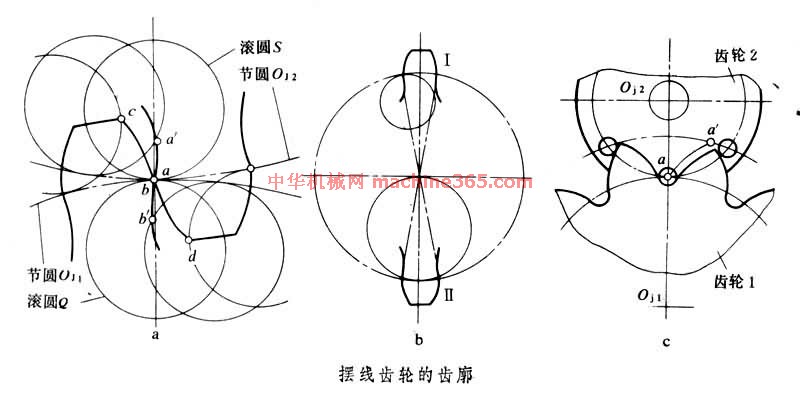 由一對擺線齒輪組成的齒輪傳動。擺線齒輪的齒廓由內(nèi)擺線或外擺線組成 (圖中a 擺線齒輪的齒廓 )。滾圓S 在節(jié)圓Oj1外面滾動形成齒頂曲線bc ﹐在節(jié)圓Oj2內(nèi)面滾動形成齒根曲線aa'﹔同樣﹐滾圓Q 在Oj1內(nèi)面滾動形成齒根曲線bb'﹐在Oj2外面滾動形成齒頂曲線ad。這樣的輪齒接觸傳動相當(dāng)於一對大小為Oj1和Oj2的摩擦輪互相滾動。擺線齒輪傳動大多用於鐘錶和某些儀器﹐與一般齒輪傳動相比﹐它的特點是﹕(1)傳動時一對齒廓中凹的內(nèi)擺線與凸的外擺線嚙合﹐因而接觸應(yīng)力小﹐磨損均勻﹔(2)齒廓的重合度較大﹐有利於彎曲強度的改善﹔(3)無根切現(xiàn)象﹐最少齒數(shù)不受限制﹐故結(jié)構(gòu)緊湊﹐也可得到較大的傳動比﹔(4)對嚙合齒輪的中心距要求較高﹐若不能保證輪齒正確嚙合﹐會影響定傳動比傳動﹔(5)這種傳動的嚙合線是圓弧的一部分﹐嚙合角是變化的﹐故輪齒承受的是交變作用力﹐影響傳動平穩(wěn)性﹔(6)擺線齒輪的製造精度要求較高。
